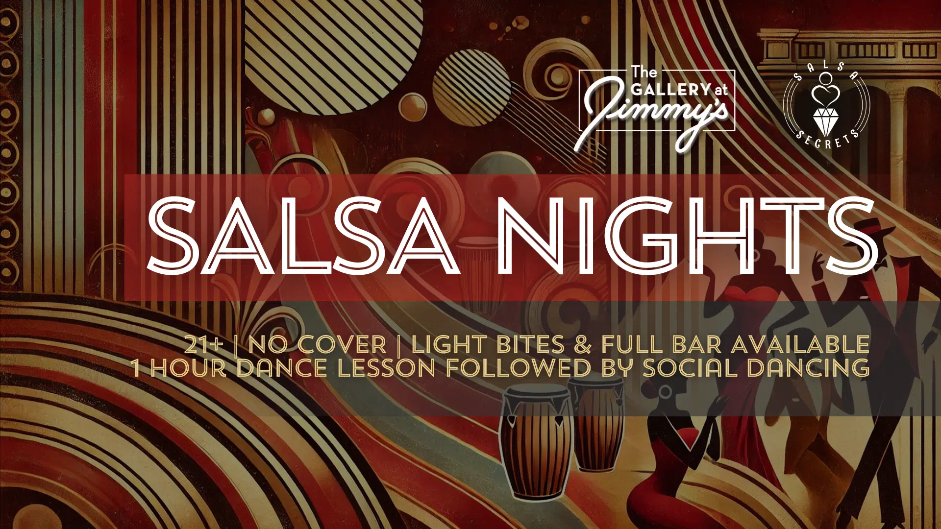 Join us for our next FREE Salsa Night at The Gallery at Jimmy’s on Sunday March 1st from 7-10pm. These nights fill up fast so please be sure to pre-register. this electrifying event invites you to immerse yourself in a world of vibrant culture and connection. Kick the night off with a one hour lesson and social dancing to follow. Indulge in craft cocktails and light bites while the sounds of live Latin ensembles fill the air. From salsa, bachata, merengue and the cha cha, the music is made to move you—dancing is not just encouraged; it’s the heartbeat of the night.