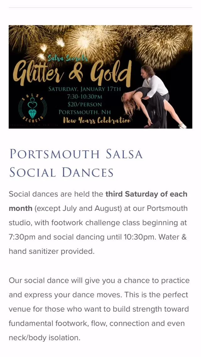 You can always email us if you have a question. Online private lessons are available at a rate of $125/hour and may be scheduled by emailing dance@salsasecrets-portsmouth.com.